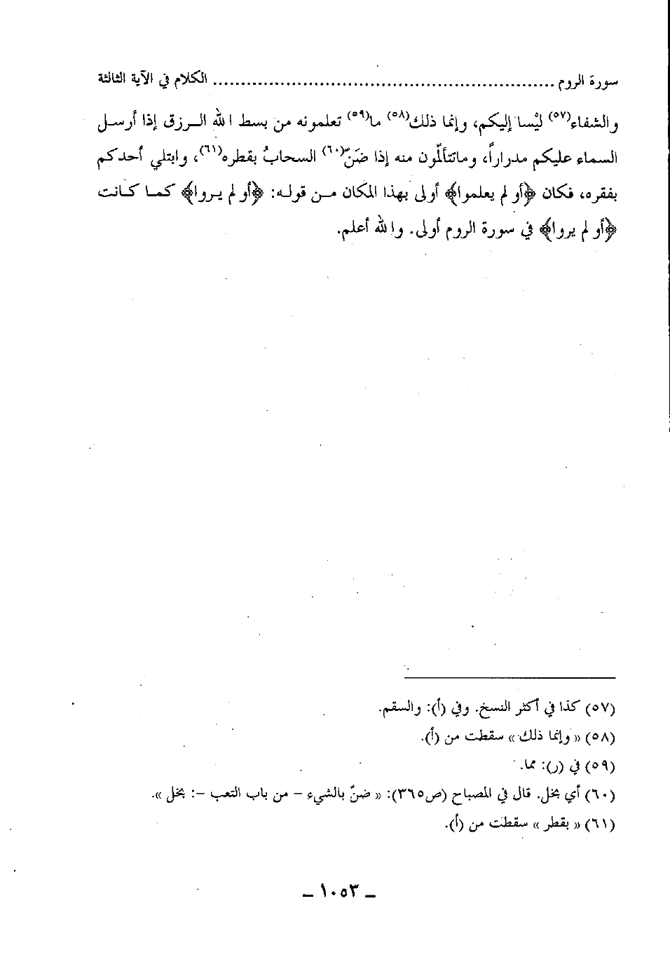 والشفاء ليْسا إليكم، وإنما ذلك ما تعلمونه عن بسط الله الرزق إذا أرسل السماء عليكم مدراراً، وما تتألمون منه إذا ضَنّ السحاب بقطره، وابتلي أحدكم بفقره، فكان (أولم يعلموا) أولى بهذا المكان من قوله: (أولم يروا) كما كانت (أو لم يروا) في سورة الروم أولى. والله أعلم.
