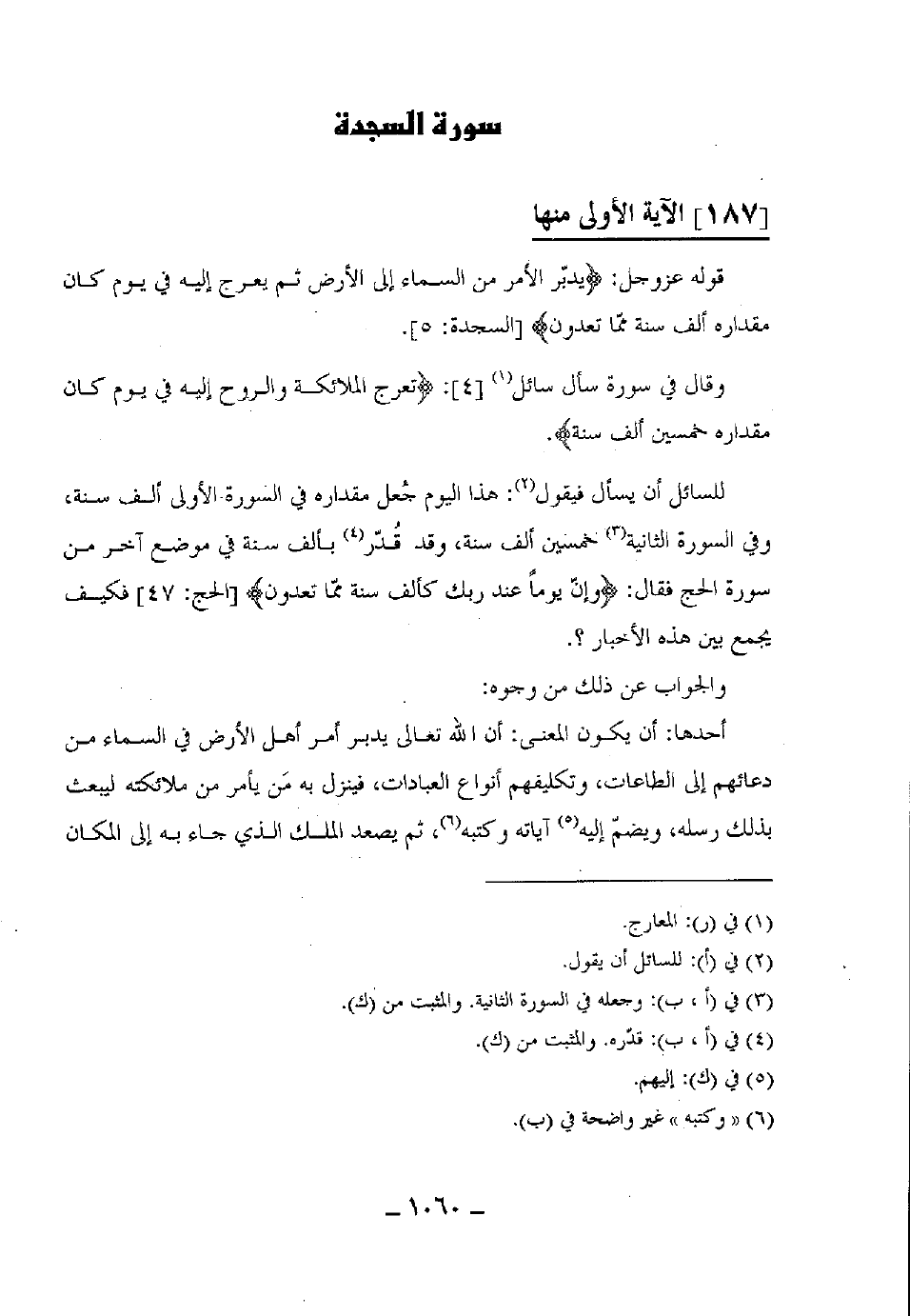 فوله عزوجل: (يُدَبِّرُ الْأَمْرَ مِنَ السَّمَاءِ إِلَى الْأَرْضِ ثُمَّ يَعْرُجُ إِلَيْهِ فِي يَوْمٍ كَانَ مِقْدَارُهُ أَلْفَ سَنَةٍ مِمَّا تَعُدُّونَ (5) .