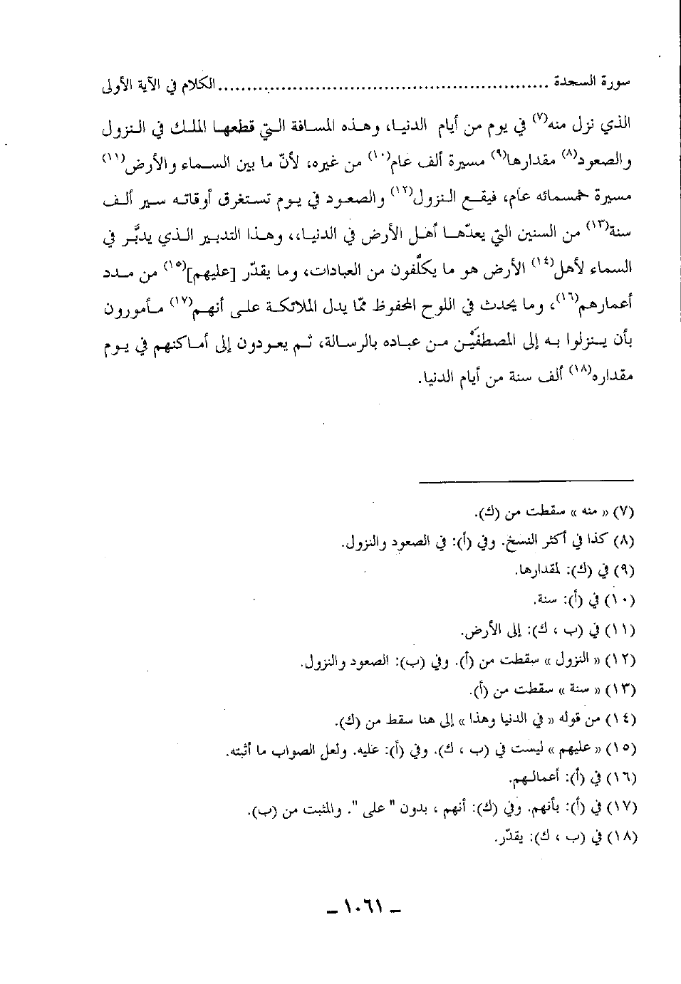 الذي نزل منه في يوم من أيام الدنيا، وهذه المسافة التي قطعها الملك في النزول والصعود مقدارها مسيرة ألف عام من غيره، لأنّ ما بين السماء والأرض مسيرة خمسمائة عام، فيقع النزول والصعود في يوم تستغرق أوقاته سير ألف سنة من السنين التي يعدها أهل الأرض في الدنيا،، وهذا التدبير الذي يدبر في السماء لأهل الأرض هو ما يكلفون من العبادات، وما يقدر عليهم، من مدد أعمارهم، وما يحدث في اللوح المحفوظ ممّا يدل الملائكة على أنهم مأمورون بأن ينزلوا به إلى المصطفَيْن من عباده بالرسالة، ثم يعودون إلى أماكنهم في يوم مقداره ألف سنة من أيام الدنيا.