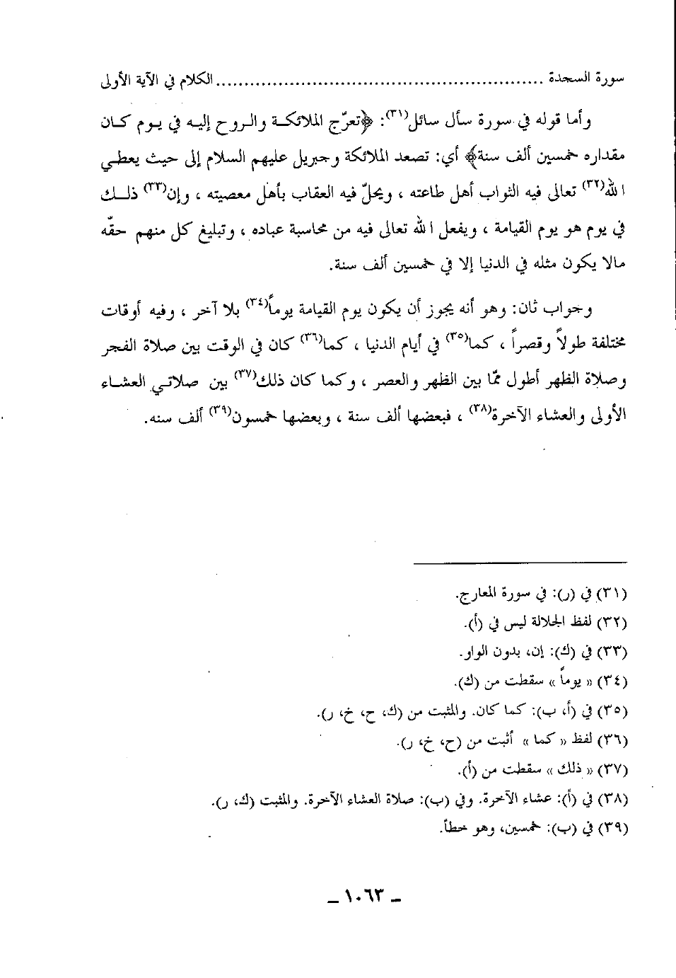 وجواب ثان: وهو أنه يجوز أن يكون يوم القيامة يوما بلا آخر، وفيه أوقات مختلفة طولا وقصرا، كما في أيام الدنيا، كما كان في الوقت بين صلاة الفجر وصلاة الظهر أطول ممّا بين الظهر والعصر، وكما كان ذلك بين صلاتى العشاء الأولى والعشاء الآخرة فبعضها ألف سنة، وبعضها خمسون ألف سنة.