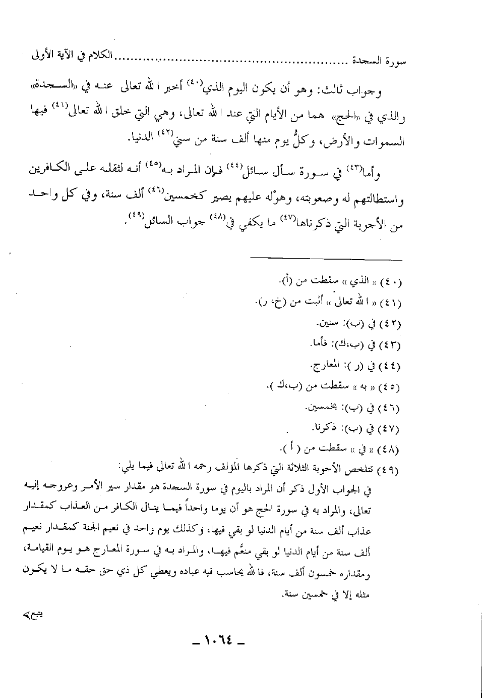 وجواب ثالث: هو أن يكون اليوم الذي أخبر الله تعالى عنه في السجدة والذي في الحج هما من الأيام التي عند الله تعالى، وهي التي خلق الله تعالى فيها السموات والأرض، وكلُّ يم منها ألف سنة من سني الدنيا.