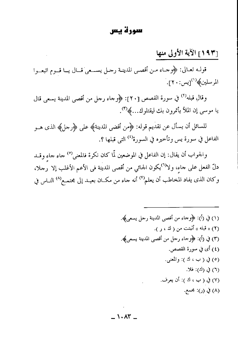 للسائل أن يسأل عن تقديم قوله: (مِنْ أَقْصَا الْمَدِينَةِ) على (رجل) الذى هو الفاعل في سورة يس وتأخيره في السورة التى قبلها؟.