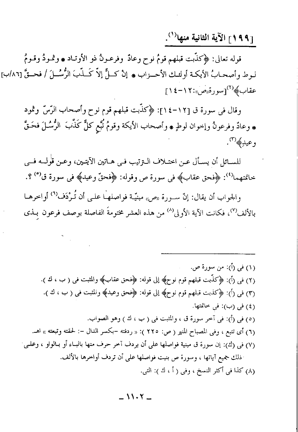 خاتمتهما: (فَحَقَّ عِقَابِ) فى سورة ص وقوله: (فَحَقَّ وَعِيدِ) فى سورة ق. والجواب أن يقال: إن سورة "ص" مبنيّة فواصلها على أن تُرْدَف أواخرها