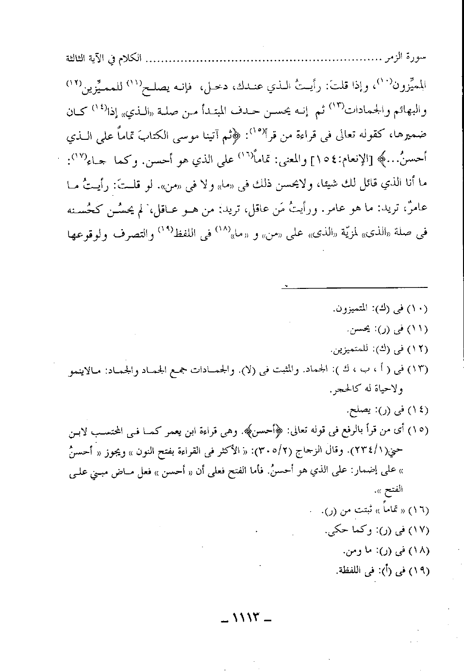 المميِّزون، وإذا قلتَ: رأيتُ الذي عندك دخل، فإنه يصلح للمميّزين والبهائم والجمادات ثم إنه يحسن حذف المبتدأ من صلة (الذي) إذا كان ضميرها، كقوله تعالى فى قراءة من قرأ: (ثُمَّ آتَيْنَا مُوسَى الْكِتَابَ تَمَامًا عَلَى الَّذِي أَحْسَنَ ... ) ، والمعنى: تماماً على الذي هو أحسن، وكما جاء: ما أنا بالذي قائل لك شيئا، ولا يحسن ذلك فى "ما" ولا فى "من " لو قلتَ: رأيتُ ما عامر، تريد: ما هو عامر. ورأيتُ مَن عاقل، تريد من هو عاقل، لم يحسُن كحسنه فى صلة "الذى" لمزيّة "الذي" على "من " و "ما" فى اللفظ والتصرف ولوقوعها