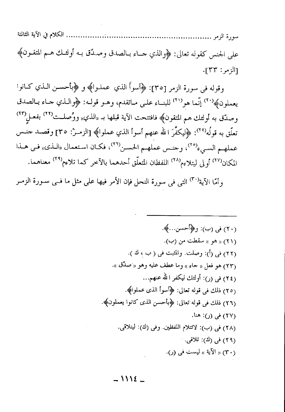 وقوله فى سورة الزمر: (أَسْوَأَ الَّذِي عَمِلُوا) و (بِأَحْسَنِ الَّذِي كَانُوا يَعْمَلُونَ) إنّما هو للبناء على م اتقدم، وهو قوله: (وَالَّذِي جَاءَ بِالصِّدْقِ وَصَدَّقَ بِهِ أُولَئِكَ هُمُ الْمُتَّقُونَ (33)