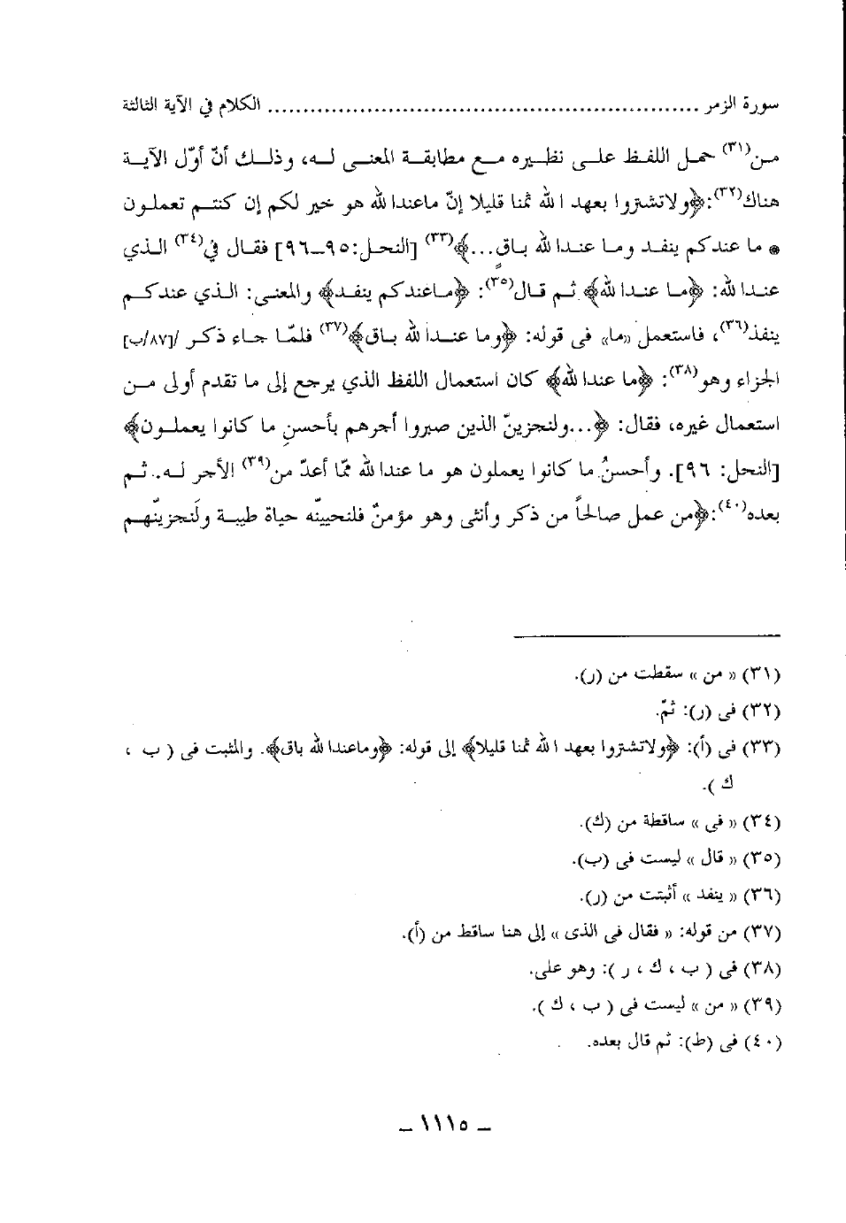 فقال في الذي عند الله: "ما عند الله. ثم قال: (ماعندكم ينفد) والمعنى: الذي عندكم ينفد، فاستعمل "ما" فى قوله: (وَمَا عِنْدَ اللَّهِ بَاقٍ ... ) فلمّا جاء ذكر الجزاء وهو: (مَا عِنْدَ اللَّهِ) كان استعمال اللفظ الذي يرجع إلى ما تقدم أولى من استعمال غيره، فقال: ( ... وَلَنَجْزِيَنَّ الَّذِينَ صَبَرُوا أَجْرَهُمْ بِأَحْسَنِ مَا كَانُوا يَعْمَلُونَ (96) .