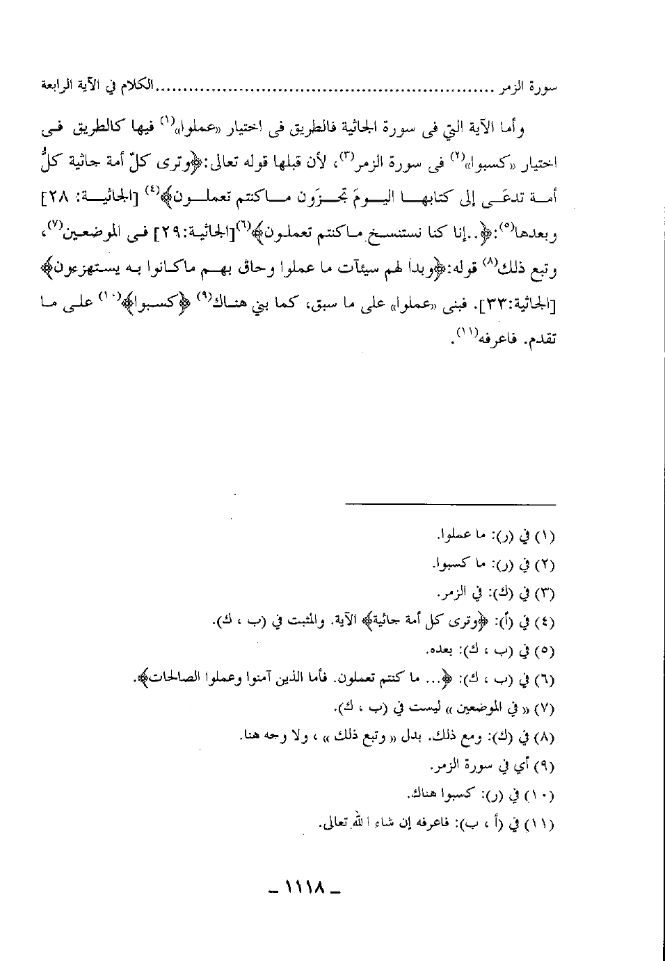 وأما الآية التي فى سورة الجاثية فالطريق فى اختيار "عملوا" فيها كالطريق فى اختيار "كسبوا" فى سورة الزمر، لأن قبلها قوله تعالى: (وَتَرَى كُلَّ أُمَّةٍ جَاثِيَةً كُلُّ أُمَّةٍ تُدْعَى إِلَى كِتَابِهَا الْيَوْمَ تُجْزَوْنَ مَا كُنْتُمْ تَعْمَلُونَ (28)