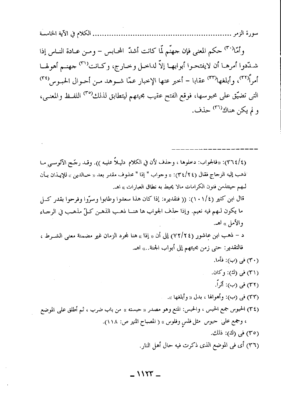 وأمّا حكم المعنى فإن جهنم لمّا كانت أشدّ المحابس ومن عادة الناس إذا شدّدوا أمرها أن لا يفتحوا أبوابها إلاّ لداخل وخارج، وكانت جهنم أهولها أمراً، وأبلغها عقابا أخبر عنها الإخبار عمّا شوهد من أحوال الحبوس التى تضيّق على محبوسها، فوقع الفتح عقيب مجيئهم ليتطابق لذلك اللفظ والمعنى، ولم يكن هناك حذف.