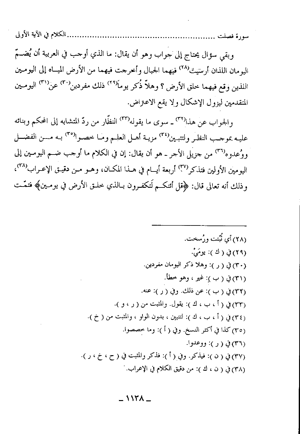 والجواب عن ذلك: سوى ما يقوله النظار من ردّ المتشابه إلى المحكم وبنائه عليه بموجب النظر ليتبين مزية أهل العلم وما خصوا به من الفضل ووُعدوه من جزيل الأجر هو أن يقال: إن في الكلام ما أوجب ضم اليومين إلى اليومين الأولين فذكر أربعة أيام في هذا المكان، وهو من دقيق الكلام فى الإعراب، وذلك أنه تعالى قال: (قُلْ أَئِنَّكُمْ لَتَكْفُرُونَ بِالَّذِي خَلَقَ الْأَرْضَ فِي يَوْمَيْنِ) فتمت