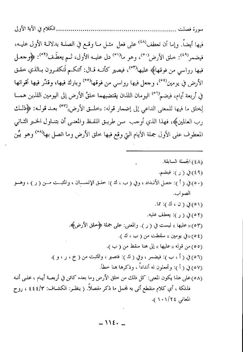 وإما أن تعطف على فعل مثل ما وقع في الصلة بدلالة الأول عليه، فيضمر: (خلق الأرض ِ) ، وهو ما دل عليه الأول، ثم يعطَف: (وجعل فيها رواسي من فوقها عليها) ، "فيصير كأنه قال: أئنكم لَتكفرون بالذي خلق الأرض في يومين، وجعل فيها رواسي من فوقها وبارك فيها، وقدّر فيها أقوأتها في أربعة أيام، فيضم) اليومان اللذان يقتضيهما خلق الأرض إلى اليومين اللذين هما لِخلق ما فيها للمعنى الداعى إلى إضمار قوله: (خلق الأرض) ، بعد قوله: (ذلك رب العالمين) فهذا الذي أوجب من طريق اللفظ والمعنى أن يتناول الخبر الثانى فى المعطوف على الأول جملة الأيام التي وقع فيها خلق الأرض وما اتصل بها وهو بيّن