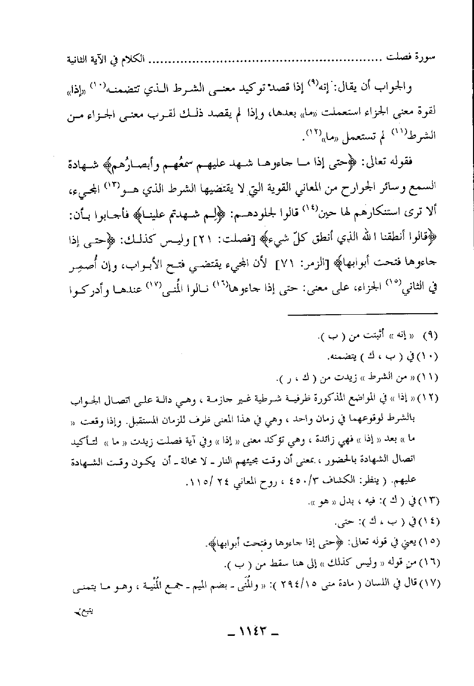 فقوله تعالى: ((حَتَّى إِذَا مَا جَاءُوهَا شَهِدَ عَلَيْهِمْ سَمْعُهُمْ وَأَبْصَارُهُمْ وَجُلُودُهُمْ) شهادة السمع وسائر الجوارح من المعاني القوية التي لا يقتضيها الشرط الذي هو المجيء، ألا ترى استنكارهم لها حين قالوا لجلودهم: (لِم شهدتم علينا) فأجابوا بأن: (قالوا أنطقنا الله الذي أنطق كل شيء) ، وليس كذلك (حتى إذا جاءوها فتحت أبوأبها) : 71، لأن المجيء يقتضي فتح الأبواب، وإن أضمِر في الثاني الجزاء على معنى: حتى إذا جاءوها نالوا المُنى عندها وأدركوا