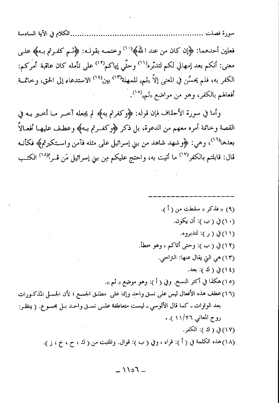 وأما في سورة الأحقاف فإن قوله: (وكفرتم به) لم يجعله آخر ما أخبر به في القصة وخاتمة أمره معهم من الدعوة، بل ذكر (وكفرتم به) وعطف عليها أفعالا بعدها، وهى: (وشهد شاهد من بني إسرائيل على مثله فآمن واستكبرتم) فكأنه قال: قابلتم بالكفر ما أتيت به؟ واحتج عليكم مِن بني إسرائيل مَن قرأ الكتب