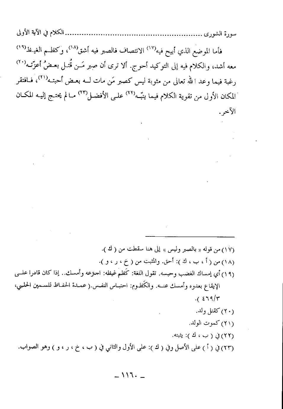 فأما الموضع الذي أبيح فيه الانتصاف فالصبر فيه أشق، وكظم الغيظ معه أشد، والكلام فيه إلى التوكيد أحوج. ألا ترى أن صبر مَن قُتل بعضُ أعزته رغبة فيما وعده الله تعالى من مثوبة ليس كصبر مَن مات له بعض أحبته، فافتقر المكان الأول من تقوية الكلام فيما ينبه على الأفضل ما لم يحتج إليه المكان الآخر.