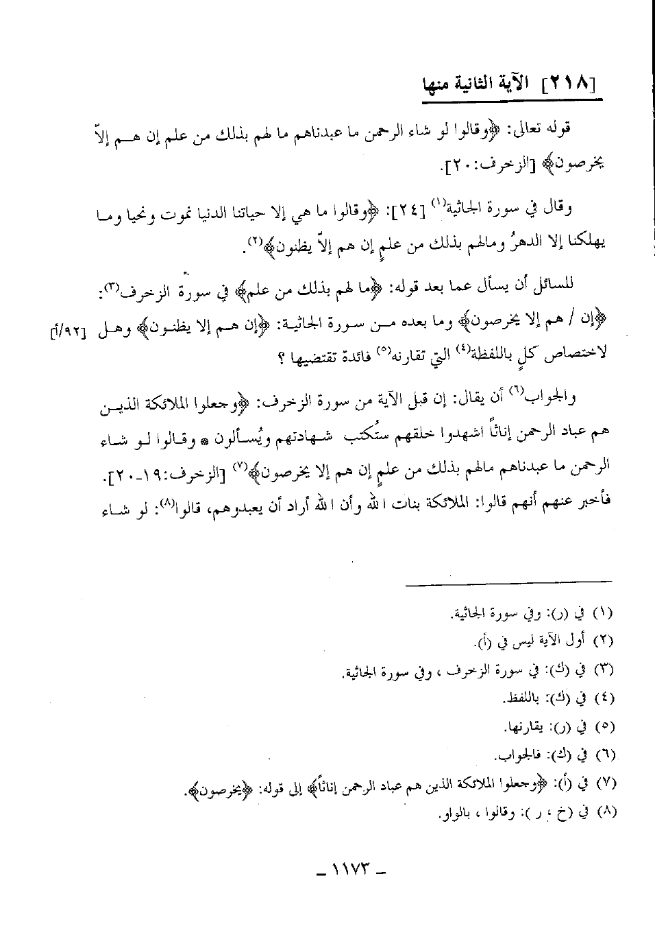 والجواب أن يقال: إن قبل الآية من سورة الزخرف: (وَجَعَلُوا الْمَلَائِكَةَ الَّذِينَ هُمْ عِبَادُ الرَّحْمَنِ إِنَاثًا أَشَهِدُوا خَلْقَهُمْ سَتُكْتَبُ شَهَادَتُهُمْ وَيُسْأَلُونَ (19) وَقَالُوا لَوْ شَاءَ الرَّحْمَنُ مَا عَبَدْنَاهُمْ مَا لَهُمْ بِذَلِكَ مِنْ عِلْمٍ إِنْ هُمْ إِلَّا يَخْرُصُونَ (20) .