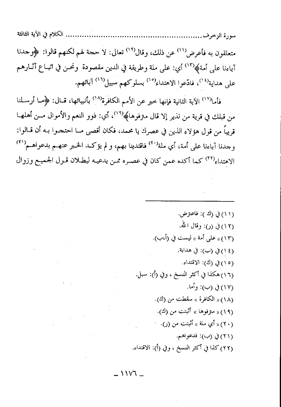 وأما الآية الثانية فإنها خبر عن الأمم الكافرة بأنبيائها، قال: (مَا أَرْسَلْنَا مِنْ قَبْلِكَ فِي قَرْيَةٍ مِنْ نَذِيرٍ إِلَّا قَالَ مُتْرَفُوهَا) ، أي: ذووا النعم والأموال من أهلها قريبا من قول هؤلاء الذين في عصرك يا محمد، فكان أقصى ما احتجوا به أن قالوا: وجدنا أباءنا على أمة، أي ملة فاقتدينا بهم، ولم يؤكد الخبر عنهم بدعواهم الاهتداء كما أكده عمن كان في عصره ممن يدعيه لبطلان قول الجميع وزوال