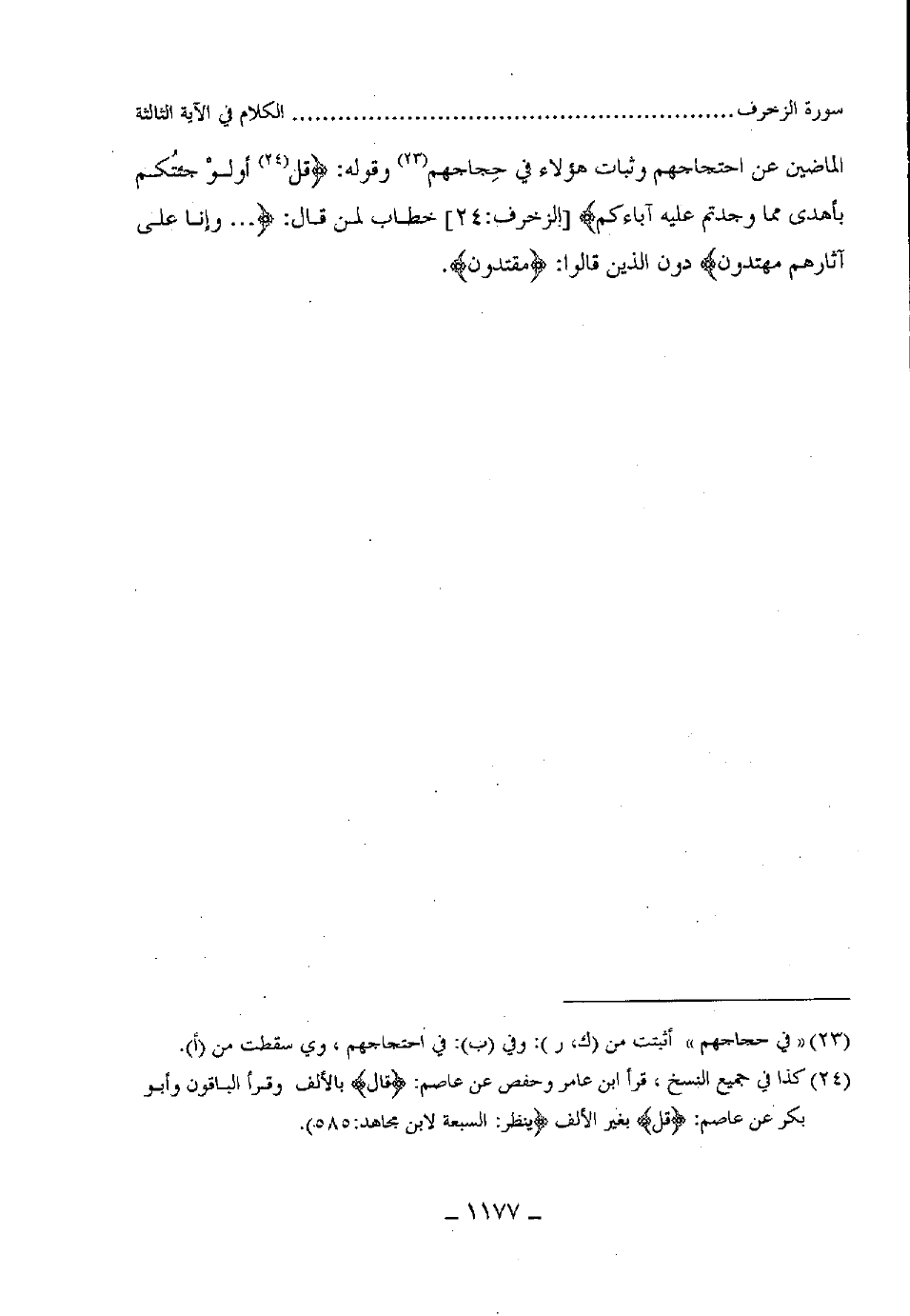الماضين عن احتجاجهم وثبات هؤلاء في حِجاجهم، وقوله: (قَالَ أَوَلَوْ جِئْتُكُمْ بِأَهْدَى مِمَّا وَجَدْتُمْ عَلَيْهِ آبَاءَكُمْ) ، خطاب لمن قال: ... (وإنا على آثارهم مهتدون) دون الذين قالوا (مقتدون) .