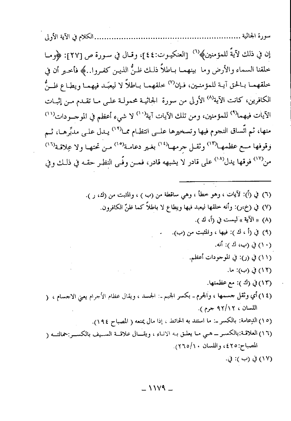 إن في ذلك لآية للمؤمنين، وقال في سورة ص: (وَمَا خَلَقْنَا السَّمَاءَ وَالْأَرْضَ وَمَا بَيْنَهُمَا بَاطِلًا ذَلِكَ ظَنُّ الَّذِينَ كَفَرُوا.. فأخبر أن في خلقهما بالحق آية للمؤمنين، وإن خلقهما باطلا لا ليعبَد فيهما ويطاع ظن الكافرين، كانت الآية الأولى من سورة الجاثية محمولة على ما تقدم من إثبات الآيات فيهما للمؤمنين، ومن تلك الآيات أنه لا شىء أعظم في الموجودات منها، ثم اتّساق النجوم فيها وتسخيرها على انتظام مما يدل على مدبِّرها، ثم وقوفها مع عظمها وثقل جرمها بغير دعامة من تحتها ولا علاقة من فوقها يدل على قدرة قادر لا يشبهه قادر، فمن وفّى النظر حقه في ذلك وفي