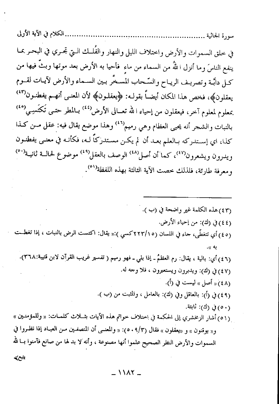 إِنَّ فِي خَلْقِ السَّمَاوَاتِ وَالْأَرْضِ وَاخْتِلَافِ اللَّيْلِ وَالنَّهَارِ وَالْفُلْكِ الَّتِي تَجْرِي فِي الْبَحْرِ بِمَا يَنْفَعُ النَّاسَ وَمَا أَنْزَلَ اللَّهُ مِنَ السَّمَاءِ مِنْ مَاءٍ فَأَحْيَا بِهِ الْأَرْضَ بَعْدَ مَوْتِهَا وَبَثَّ فِيهَا مِنْ كُلِّ دَابَّةٍ وَتَصْرِيفِ الرِّيَاحِ وَالسَّحَابِ الْمُسَخَّرِ بَيْنَ السَّمَاءِ وَالْأَرْضِ لَآيَاتٍ لِقَوْمٍ يَعْقِلُونَ (164) ، فخص هذا المكان أيضا بقوله: (يعقلون) لأن المعنى أنهم يفطون بمعلوم لمعلوم آخر، فيعقلون من إحيا الله تعالى الأرض بالمطر حتى تكتسِى بالنبات والشجر أنه يحى العظام وهي رميم وهذا موضع يقال فيه: عقل من كذا كذا، أي استدركه بالعلم بعد أن لم يكن مستدركا له، فكأنه في معنى يفطون ويدرون ويشعرون، كما أن أصل الوصف بالعقل موضوع لحالة ثانية ومعرفة طارئة، فلذلك خصت الآية الثالثة بهذه اللفظة.
