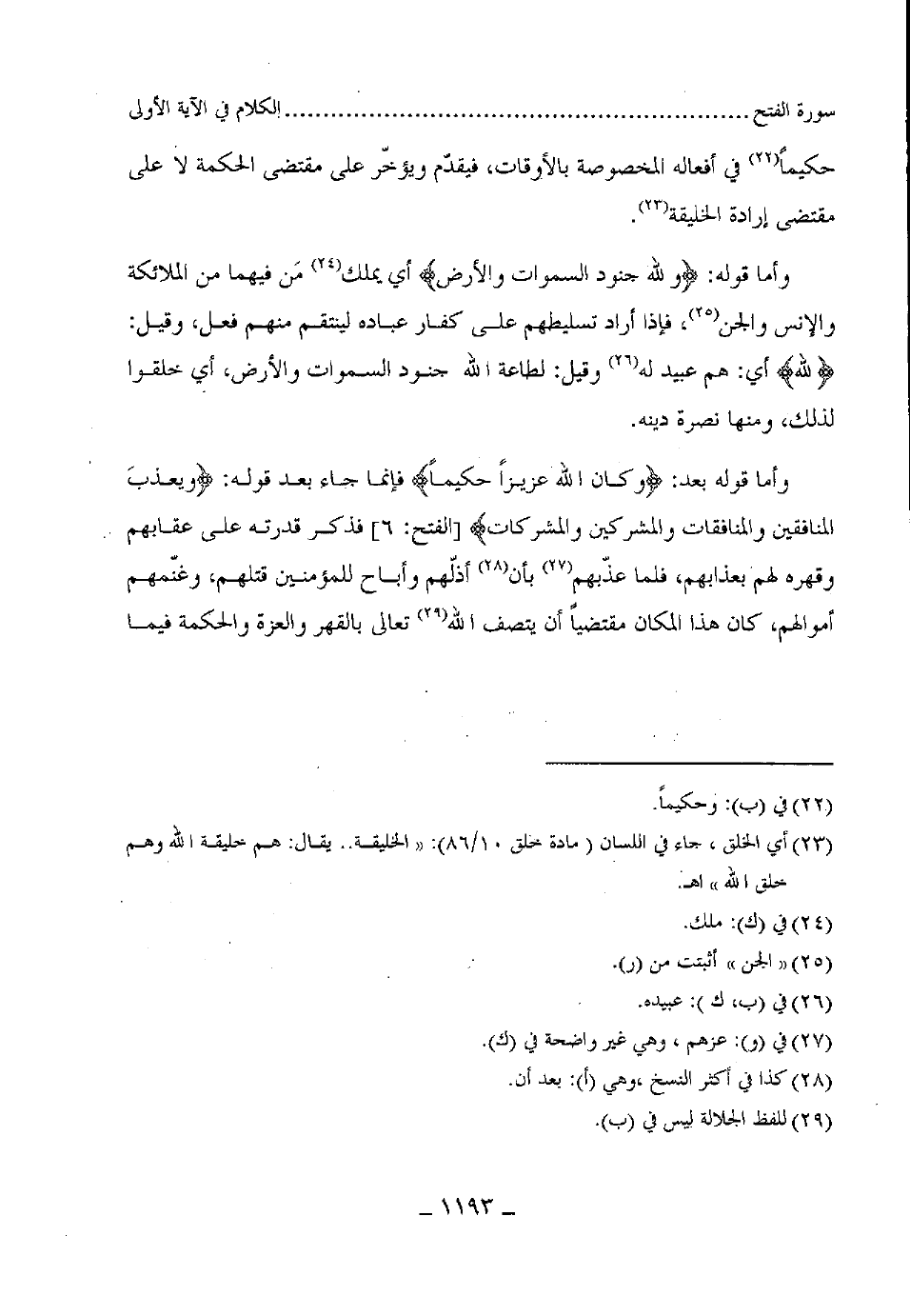 وأما قوله: (ولله جنود السموات والأرض) أي يملك مَن فيهما من الملائكة والإنس والجن، فإذا أراد تسليطهم على كفار عباده لينتقم منهم فعل، وقيل: (لله) أي: هم عبيد له وقيل: لطاعة الله جنود السموات والأرض، أي خلقوا لذلك، ومنها نصرة دينه.
