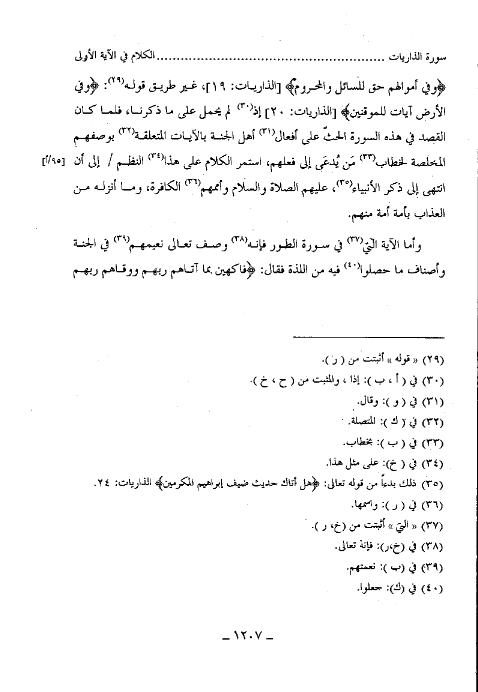 (وفي أموالهم حق للسائل والمحروم) ، غير طريق قوله: (وفي الأرض آيات للموقنين) ، إن لم يحمل على ما ذكرنا، فلما كان القصد في هذه السورة الحث على أفعال أهل الجنة بالآيات المتعلقة بوصفهم المخلصة لخطاب مَن يُدعَى إلى فعلهم، استمر الكلام على هذا النظم إلى أن انتهى إلى ذكر الأنبياء، عليهم الصلاة والسلام وأممهم الكافرة، وما أنزله من العذاب بأمة أمة منهم.