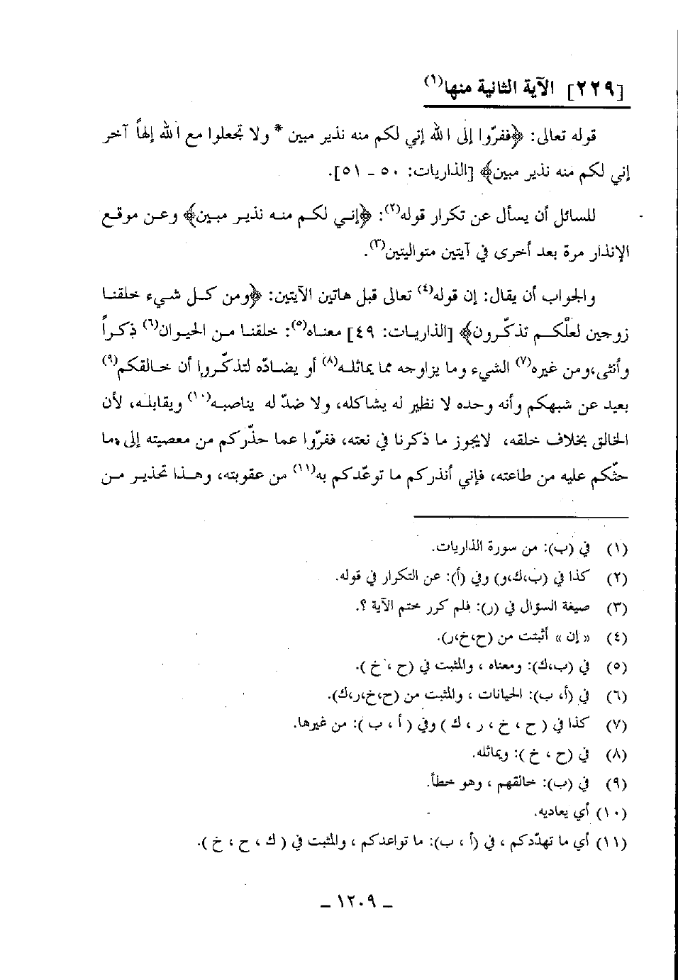 والجواب أن يقال: إن قوله تعالى قبل هاتين الآيتين: (وَمِنْ كُلِّ شَيْءٍ خَلَقْنَا زَوْجَيْنِ لَعَلَّكُمْ تَذَكَّرُونَ (49) ، ومعناه: خلقنا من الحيوانات ذكراً وأنثى، ومن غيرها الشىء وما يزاوجه مما يماثله أو يضادّه فيقابله لتذكروا أن خالقكم بعيد عن شبهكم وأنه وحده لا نظير له يشاكله، ولا ضدّ له يناصبه ويقابله، لأن الخالق بخلاف خلقه، لا يجوز ما ذكرنا في نعته، ففرّوا عما حذّركم من معصيته إلى ما حثكم عليه من طاعته، فإني أنذركم ما توعّدكم به من عقوبته، وهذا تحذير من