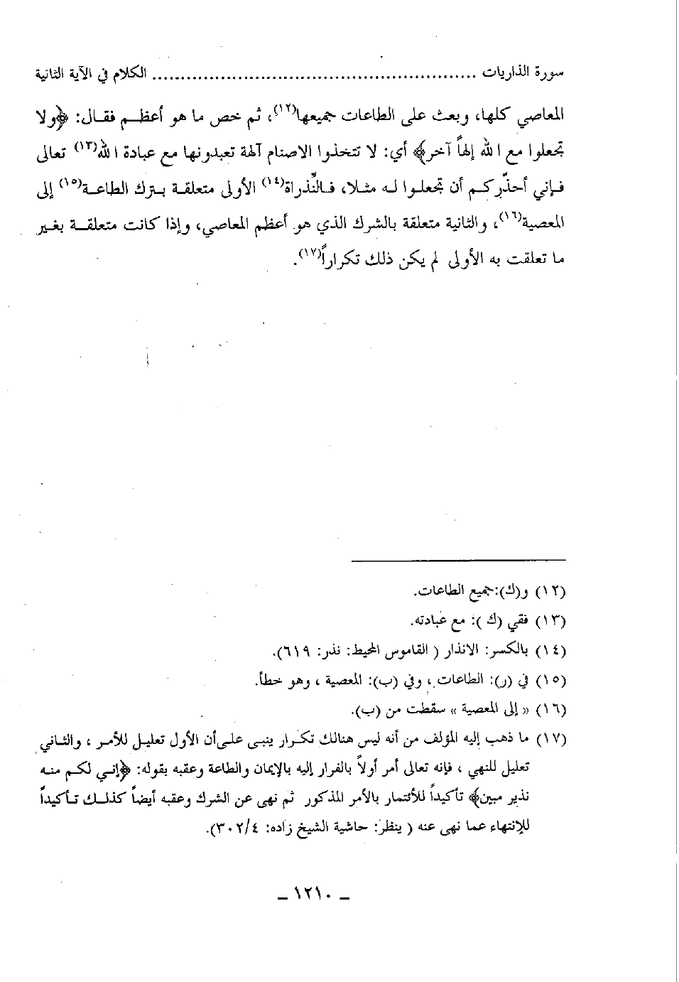 المعاصي كلها، وبعث على الطاعات جميعها، ثم خص ما هو أعظم فقال: (وَلَا تَجْعَلُوا مَعَ اللَّهِ إِلَهًا آخَرَ) أي: لا تتخذوا الأصنام آلهة تعبدونها مع عبادة الله تعالى فإني أحذركم أن تجعلوا له مثلا، فالنذراة الأولى متعلقة بترك الطاعة إلى المعصية، والثانية متعلقة بالشرك الذي هو أعظم المعاصي، وإذا كانت متعلقة بغير ما تعلقت به الأول لم يكن ذلك تكرارا.