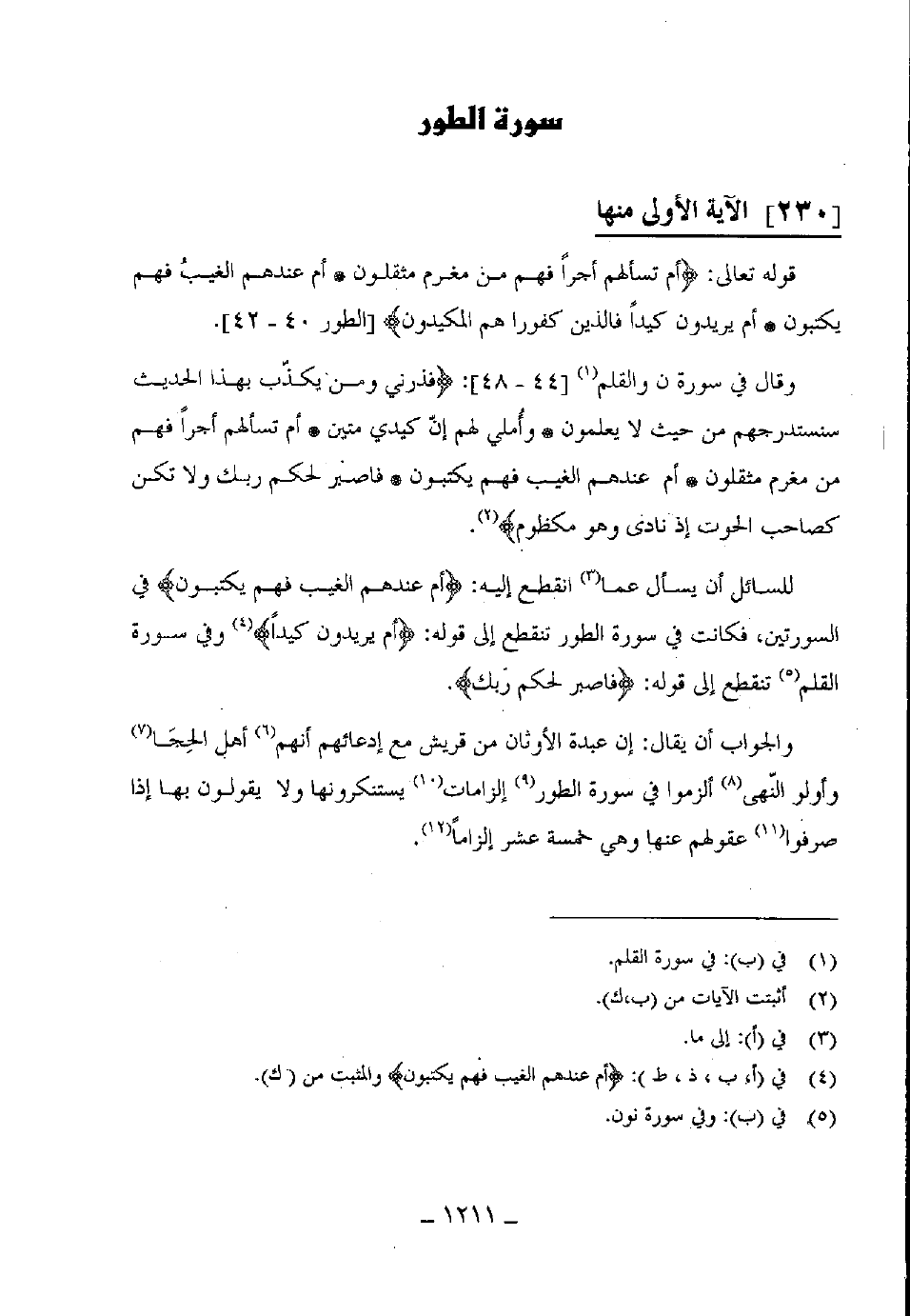 والجواب أن يقال: إن عبدة الأوثان من قريش مع إدعائهم أنهم أهل الحِجَى وأولو النّهى " ألزموا في سورة الطور إلزامات يستنكرونها ولا يقولون بها إذا صرفوا عقولهم عنه وهى خمسة عشر إلزاما.