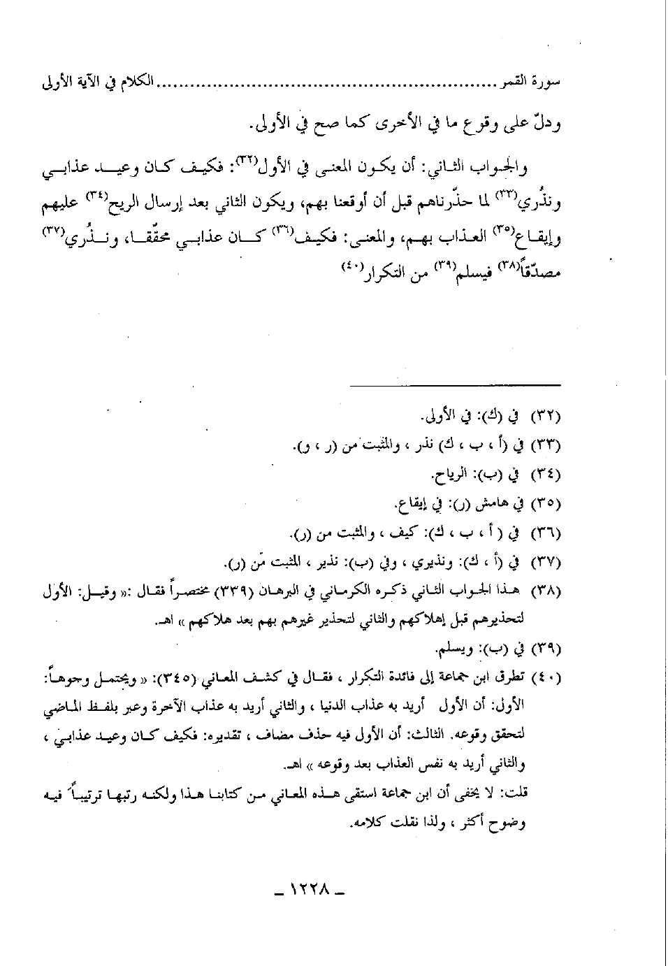 والجواب الثاني: أن يكون المعنى في الأول: فكيف كان وعيد عذابى ونذري لما حذّرناهم قبل أن أوقعنا بهم، ويكون الثاني بعد إرسال الريح عليهم وإيقاع العذاب بهم والمعنى: فكيف كان عذابي محقّقا، ونذُري مصدّقا فيسلم من التكرار