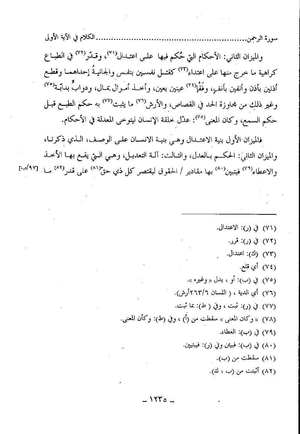 والميزان الثانى: الأحكام التى حُكم فيها على اعتدال، وقدّر في الطباع كراهية ما خرج منها على اعتداء كقتل نفسين بنفس والجانيةُ إحداهما وقطع أذنين بأذن وأنفين بأنفٍ، وفَقْإ عينين بعين، وأخذ أموال. بمال، ودواب بدابّةوغير ذلك من مجاوزة الحد في القصاص، والأرش ما يثبت به حكم الطبع قبل حبهم السمع، وكان المعنى: عدّل خلقة الإنسان ليتوخى المعدلة في الأحكام. فالميزان الأول بنية الاعتدال وهي بنية الإنسان على الوصف، الذي ذكرنا، والميزان الثاني: الحكم "بالعدل، والثالث: آلة التعديل، وهي التي يقع بها الأخذ والإعطاء فيتبين لها مقادير الحقوق ليقتصر كل ذي حق على قد ما