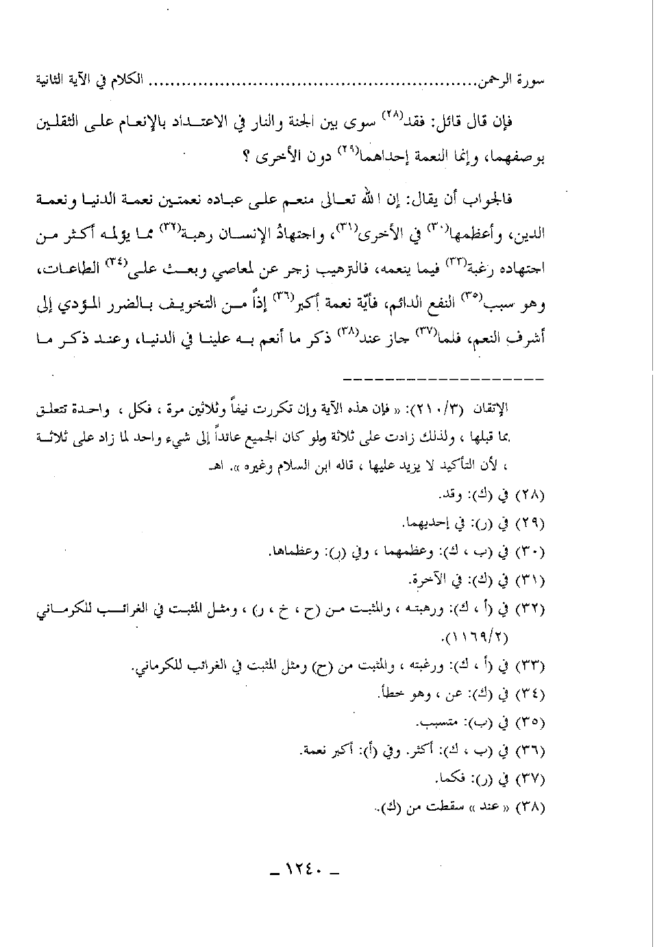فالجواب أن يقال: إن الله تعالى منعم على عباده نعمتين نعمة الدنيا ونعمة الدين، وأعظمها في الأخرى، واجتهاد الإثسان رهبة مما يؤلمه أكثر من اجتهاده رغبة فيما ينعمه، فالترهيب زجر عن المعاصي وبعث على الطاعات، وهو سبب النفع الدائم، فأية نعمة أكبر إذاً من التخويف بالضرر المؤدي إلى أشرف النعم، فلما جاز عند ذكر ما أنعم به علينا في الدنيا، وعند ذكر ما