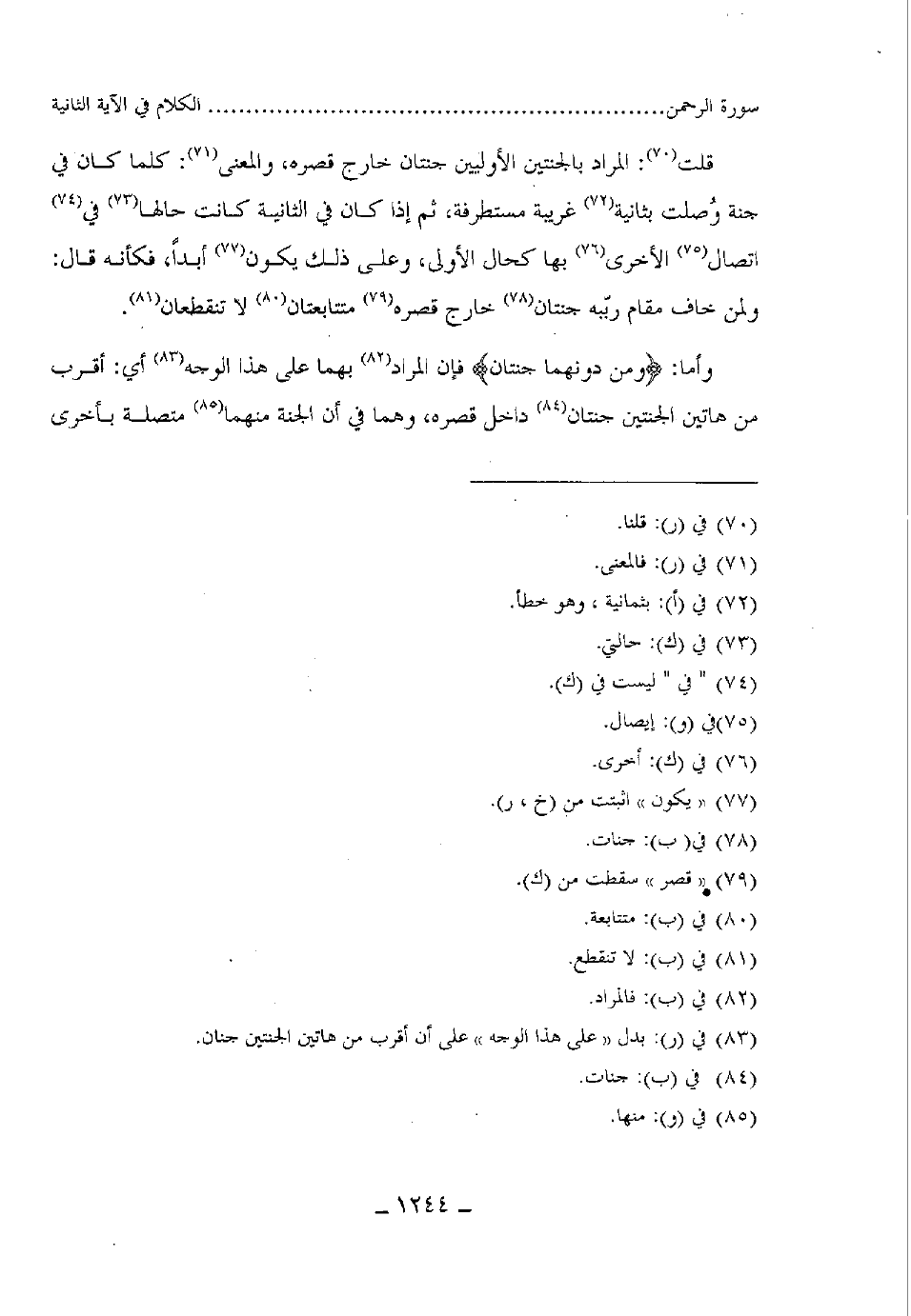جنة وُصلت بثانية غريبة مستطرفة، ثم إذا كان في الثانية كانت حالها في اتصال الأخرى بها كحال الأولى، وعلى ذلك يكون أبدا، فكأنه قال: ولمن خاف مقام ربّه جنتان خارج قصره متتابعتان لا تنقطعان.