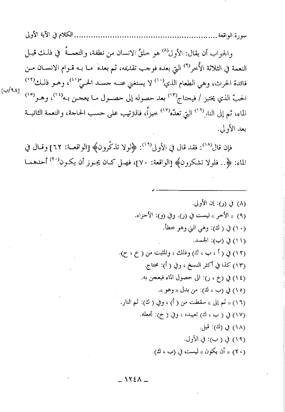 والجواب أن يقال الأول هو خلقُ الإنسان من نطفة؟ والنعمةُ في ذلك قبل النعمة في الثلائة الأخر التي بعده فوجب تقديمه، ثم بعده ما به قوام الإنسان من فائدة الحرث، وهى الطعام الذي لا يستغني عنه جسد الحىّ، وهو ذلك الحبّ الذي يختبز فيحتاج بعد حصوله إلا حصول ما يعجن به، وهو الماء، ثم إلى النار التي تعدّه خبزا فالترتيب على حسب الحاجة، والنعمة الثانية بعد الأولى.