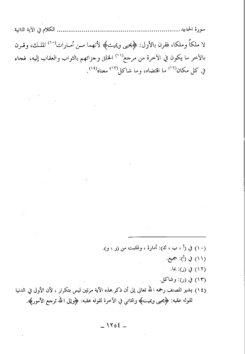 لا ملكا وملكا، فقرن بالأول: (يُحْيِي وَيُمِيتُ) لأنهما من أمارات الملك وقرن بالآخر ما يكون في الآخرة من مرجع الخلق وجزائهم بالثواب والعقاب إليه، فجاء في كل مكان ما اقتضاه، وما شاكل معناه.