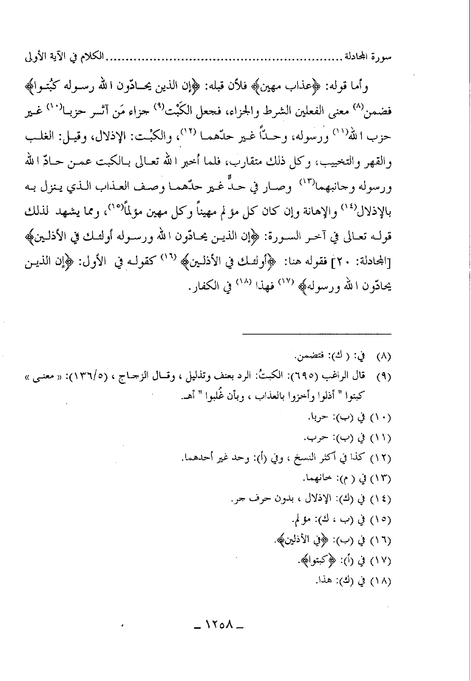 وأما قوله: (عذاب مهين) فلأن قبله: (إِنَّ الَّذِينَ يُحَادُّونَ اللَّهَ وَرَسُولَهُ كُبِتُوا) فضمن معنى الفعلين الشرط والجزاء، فجعل الكَبْت جزاء مَن آثر حزبا غير حزب الله ورسوله، وحدا غير حدّهما، والكبْت: الإذلال، وقيل: الغلب والقهر والتخييب، وكل ذلك متقارب، فلما أخبر الله تعالى بالكبت عمن حادّ الله ورسوله وجانبهما وصار في حد غير حدّهما وصف العذاب الذي ينزل به بالإذلال والاهانة وإن كان كل مؤلم مهيناً وكل مهين مؤلمأ، ومما يشهد لذلك قوله تعالى في آخر السورة: إن الذين يحادّون الله ورسوله أولئك في الأذلين) ، فقوله هنا: (أولئك في الأذلين) كقوله في الأول: (إن الذين يحادّون الله ورسوله) فهذا في الكفار.