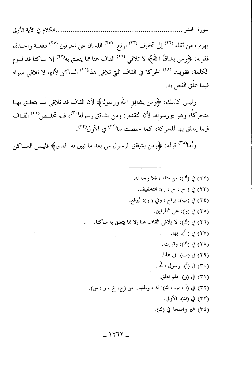يهرب من ثقله إلى تخفيف برفع اللسان عن الحرفين دفعة واحدة، فقوله: (ومن يشاق الله) لا تلاقي القاف هنا مما يتعلق به إلا ساكنا قد لزم الكلمة فقويت الحركة في القاف التي تلاقي هذا الساكن لأنها لا تلاقي سواه فيما علّق الفعل به.