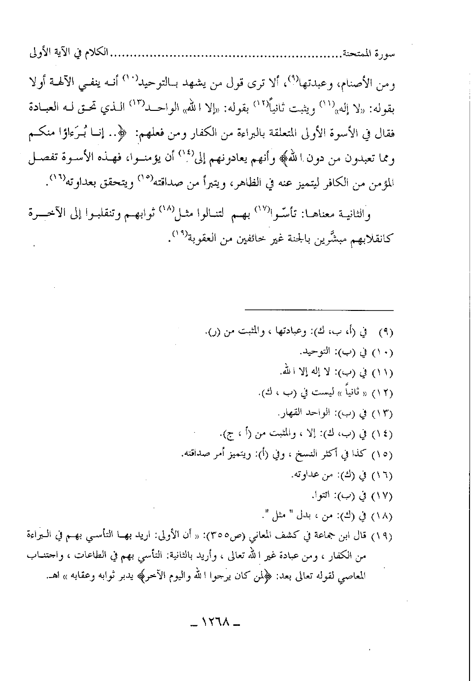ومن الأصنام، وعبدتها، ألا ترى قول من يشهد بالتوحيد أنه ينفى الآلهة أولا بقوله: " لا إله " ويثبت ثانيا بقوله "إلا الله " الواحد الذي تحق له العبادة فقال في الأسوة الأولى المتعلقة بالبراءة من الكفار ومن فعلهم (.. إِنَّا بُرَآءُ مِنْكُمْ وَمِمَّا تَعْبُدُونَ مِنْ دُونِ اللَّهِ) وأنهم يعادونهم إلى أن يؤمنوا، فهذه الأسوة تفصل المؤمن من الكافر ليتميز عنه في الظاهر، ويتبرأ من صداقته ويتحقق بعداوته. والثانية معناها: تأسّوا بهم لتنالوا مثل ثوابهم وتنقلبوا إلى الآخرة كانقلابهم مبشرين بالجنة غير" خائفين من العقوبة.