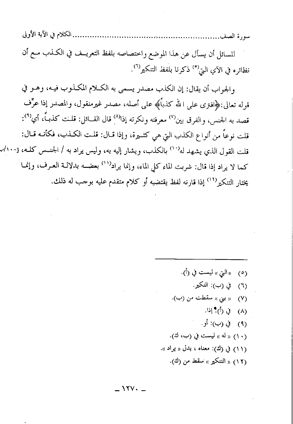 ْللسائل أن يسأل عن هذا الموضع واختصاصه بلفظ التعريف في الكذب مع أن نظائره في الآي التي ذكرنا بلفظ التنكير.