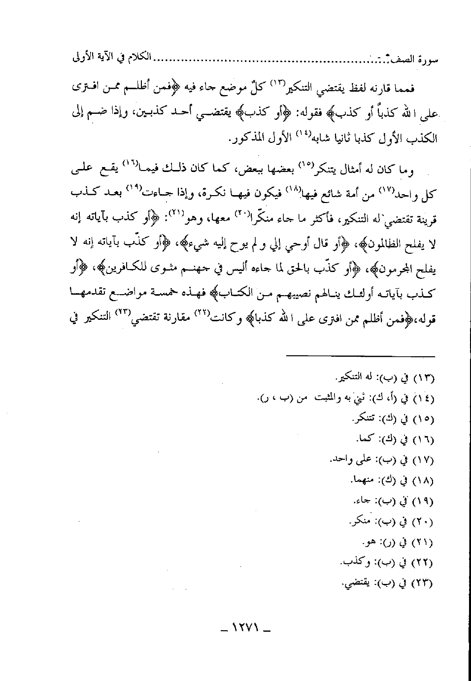 ومما قارنه لفظ يقتضي له التنكير كل موضع جاء فيه (فمن أظلم ممن افترى على الله كذبا أو كذب فقوله: (أو كذب يقتضي أحد كذبينْ، وإذا ضم إلى الكذب الأول كذبا ثانيا يثنى الأول المذكور.