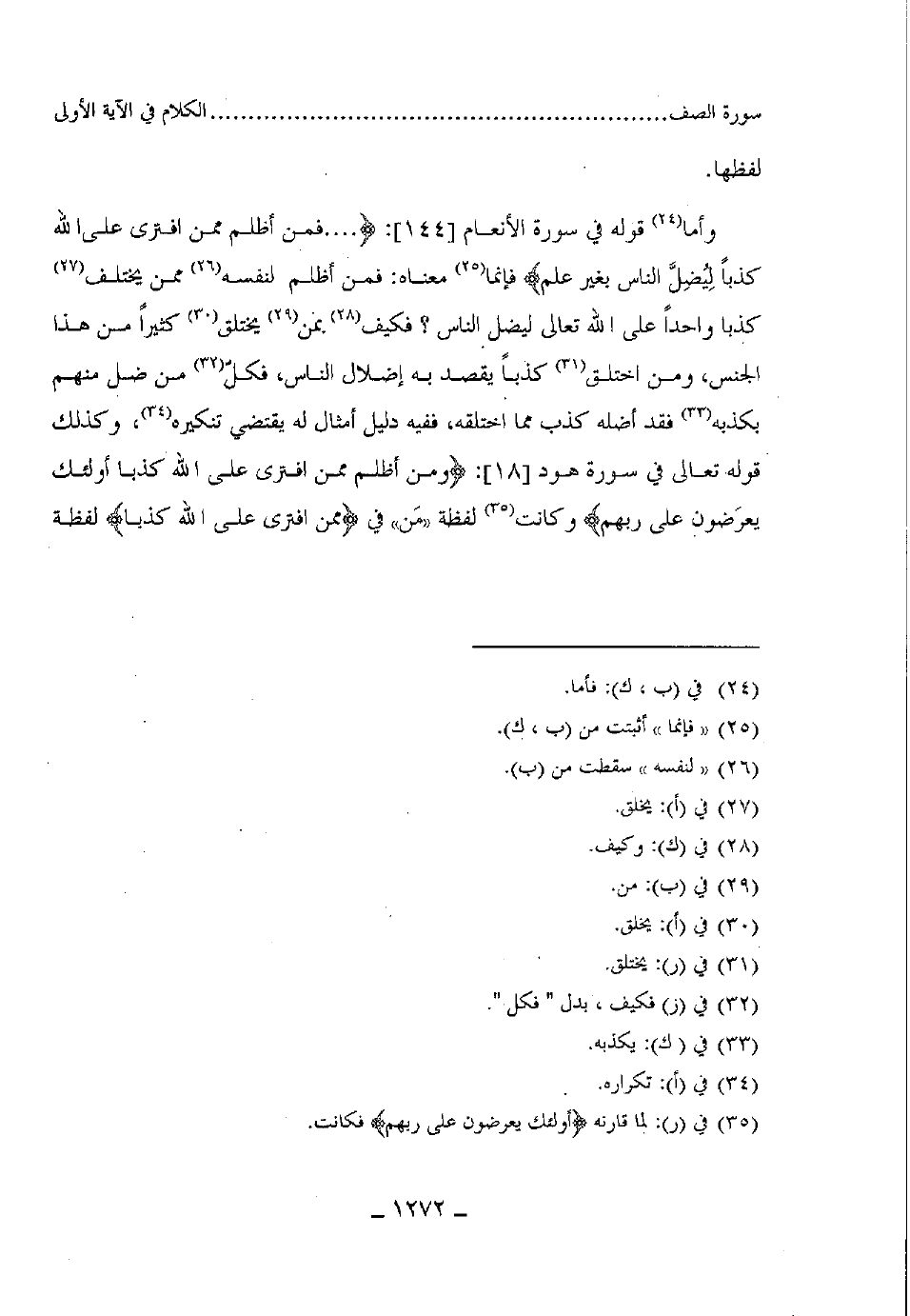 من ضل منهم يكذبه فقد أضله كذب أخلقه، ففيه دليل أمثال له يقتضى تنكيره، وكذلك قوله تعالى في سورة هود: (ومن أظلم ممن افترى على الله كذبا أولئك يعرَضون على ربهم) فكانت لفظة "من، (ممن افترَى على الّه كذبا* لفظة واحدة