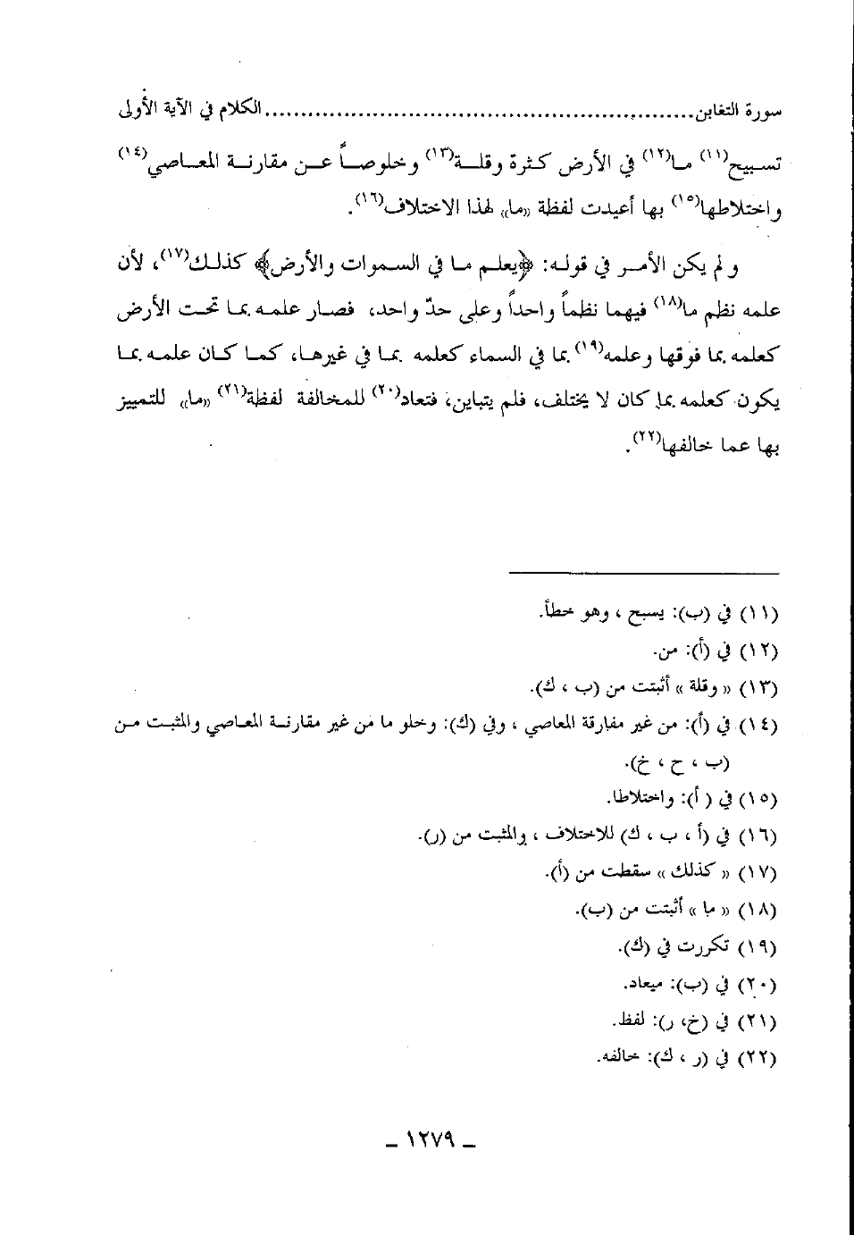 ولم يكن الأمر في قوله: (يعلم ما فى السموات والأرض كذلك، لأن علمه نظم ما فيهما نظما واحدا وعلى حدّ واحد، فصار علمه بما تحت الأرض كعلمه بما فوتها وعلمه بما في السماءكعلمه بما في غيرها، كما كان علمه بما يكون كعلمه بما كان لا يختلف، فلم يتباين، فتعاد للمخالفة لفظة "ما" للتمييز بها عما خالفها.