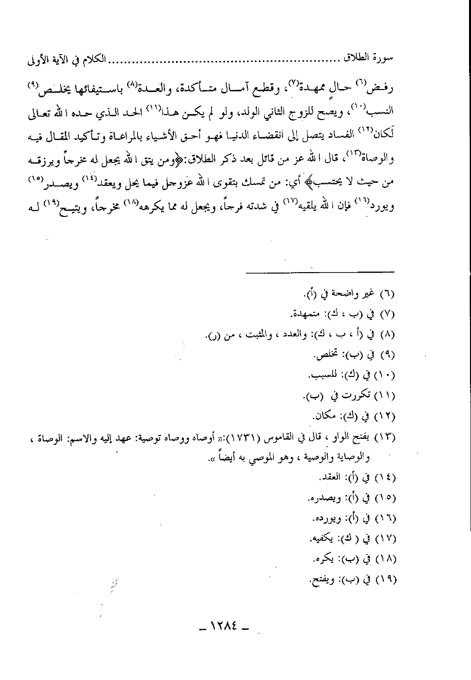 رفض حال متمهدة، وقطع آمال متأكدة"، والعدة باستيفائها يخلص النسب، ويصح للزوج الثاني الولد، ولو لم يكن هذا الحد الذي حده الله تعالى لَكان الفساد متصلا فى انقضاء الدنيا فهو أحق الأشياء بالمراعاة وتأكيد المقال فيه والوصاة، قال الله عز من قائل بعد ذكر الطلاق: (. وَمَنْ يَتَّقِ اللَّهَ يَجْعَلْ لَهُ مَخْرَجًا (2) وَيَرْزُقْهُ مِنْ حَيْثُ لَا يَحْتَسِبُ) أي: من تمسك بتقوى الله عز وجل فيما يحل ويعقد ويصدر ويورد فإن الله يلقيه في شدته فرجا ويجعل له مما يكرهه مخرحا، ويتيح له