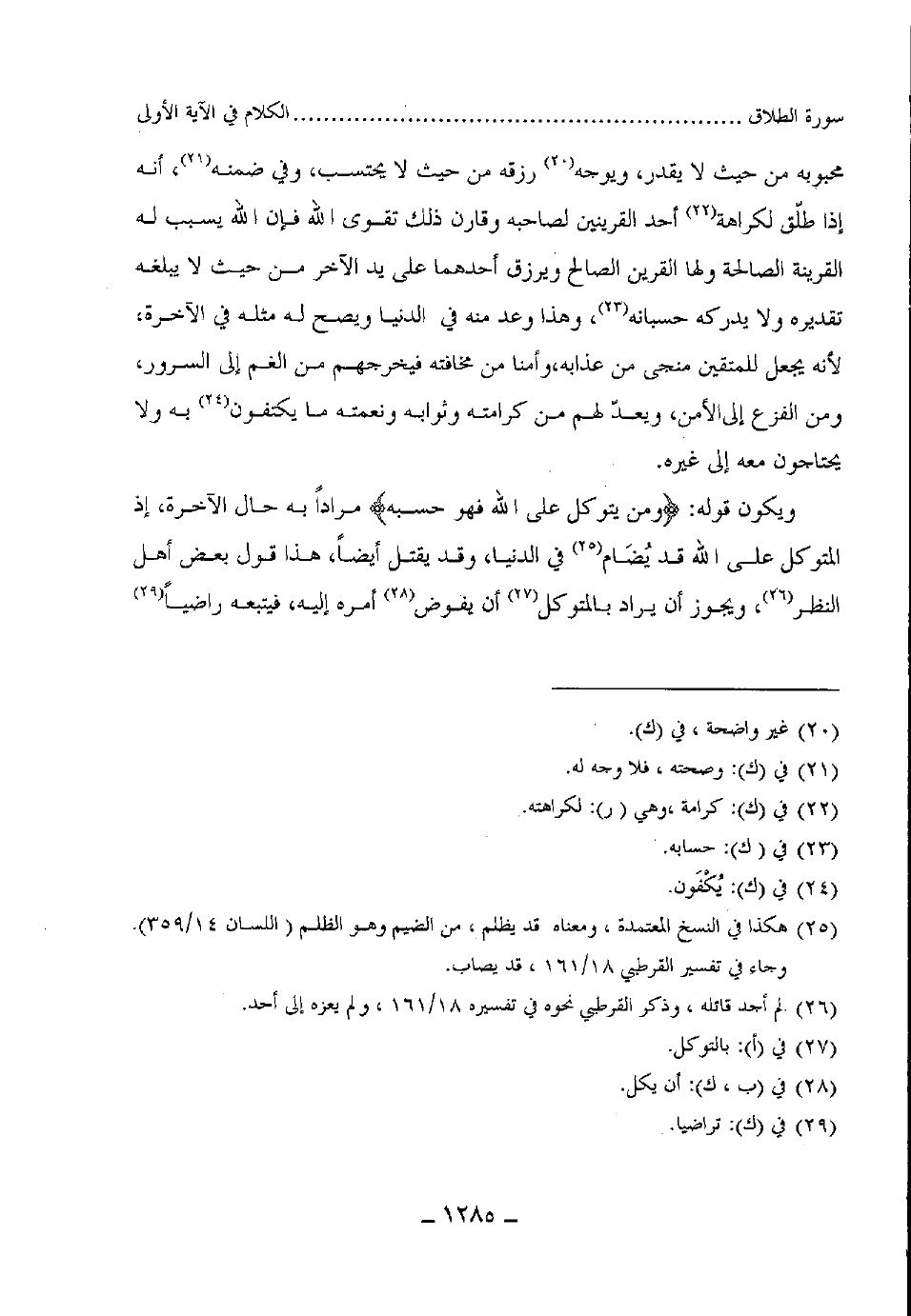 ويكون قوله: (ومن يتوكل على الله فهو حسبه) مرادا به حال الآخرة إذ المتوكل على الله قد يضَام في الدنيا، وقد يقتل أيضا، هذا قول بعض أهل النظر، ويجوز أن يراد بالتوكل أن يكل أمره إليه، فيتبعه راضيا