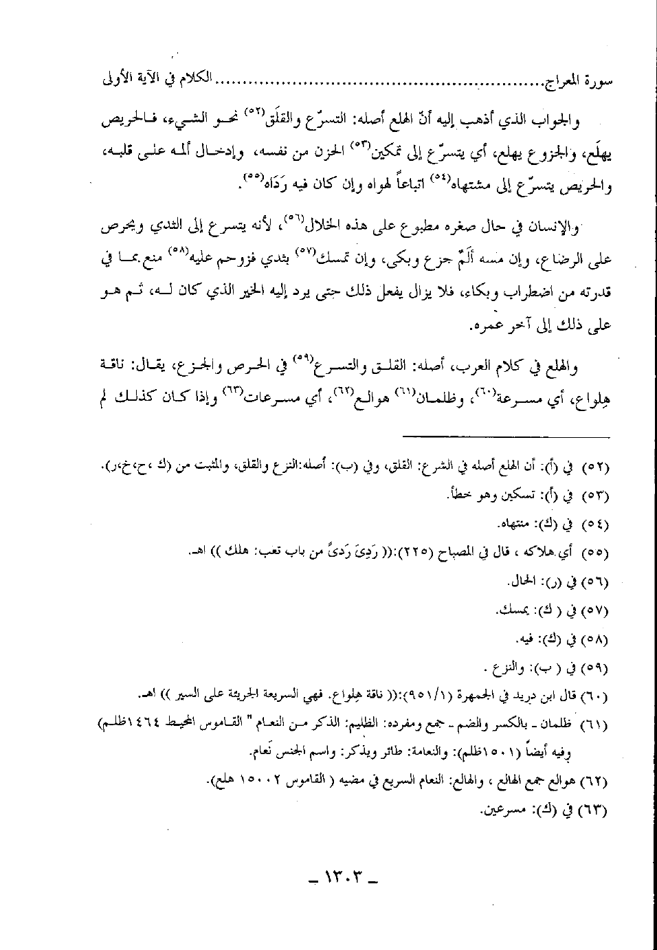 الجواب الذي أذهب اليه أن الهلع أصلهالتسرّع والقلَق نحو الشيء، فالحريص يهلَع، والجزع يهلع، أي يتسرّع إلى تمكين الحزن من نفسه، وإدخال ألمه على قلبه، والحريص يتسرّع إلى مشتهاه اتباعا لهواه وإن كانن فيه رَداه.