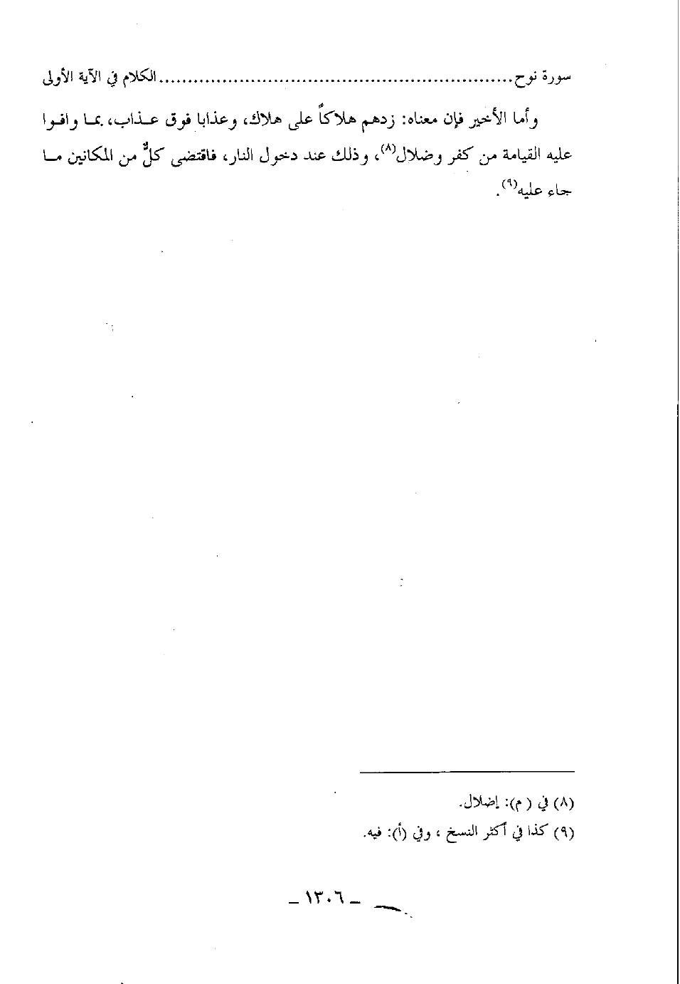 وأما الآخر فإن معناه؟ زدهم هلاكا على هلاك، وعذابا فوق عذاب بما وافوا عليه القيامة من كفر وضلال، وذلك عند دخول النار، فاقتضى كلّ من المكانين ما جاء فيه.