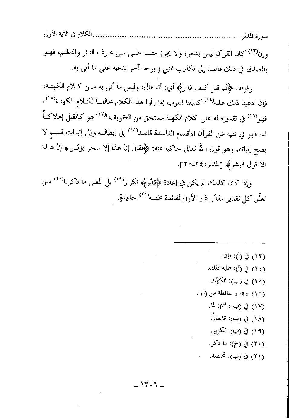 فإن ادعينا ذلك عليه كذبتنا العرب إذا رأوا هذا الكلام مخالفا لكلام الكهان، فهو في ئقديره له على كلام الكهنة مستحق من العقوبة لما هو كالقتل إهلاكا له، فهو في نفيه عن القرآن الأقسام الفاسدة قاصد إلى إبطاله وإلى إثبات قسم لا يصح إثباته، وهو قول الله تعالى، حاكيا عنه: (فقال إنْ هذا إلا سحر يؤثر إنْ هذا إلا قول البشر) .