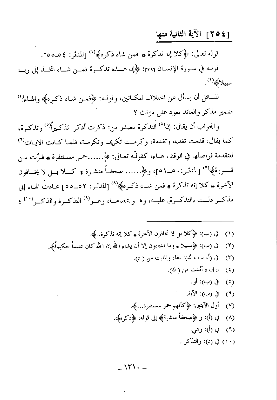 كما يقال: قدمت تقديما وتقدمة، وكرمت تكريما وتكرمة، فلما كانت الآيات المتقدمة فواصلها في الوقف هاء، كقوله لَعافى: (..... حمر مستنفرة فرّت من قسورة) و (...... صحفا منشرة كلا بل لا يخافون الآخرة كلا إنه تذكرة فمن شاء ذكره) عادت الهاء إلى مذكر دلت التذكرة عليه، وهو بمعناها، وهو" التذكرة والتذكر