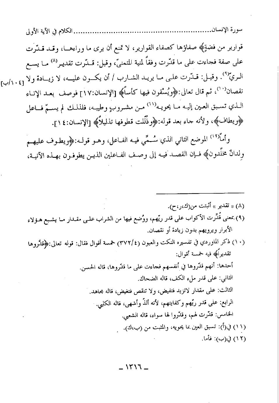على صفة فجاءت على ما قدّرت وفقا لمنية المتمنىّ، وقيل: قدرت تقدير ما يسع الريّ. وقيل: قدّرت على ما يريد الشارب أن يكون عليه، لا زيادة ولا نقصان، ثم قال تعالى: (ويُسْقون فيها كأسا) ، فوصف بعد الإناء