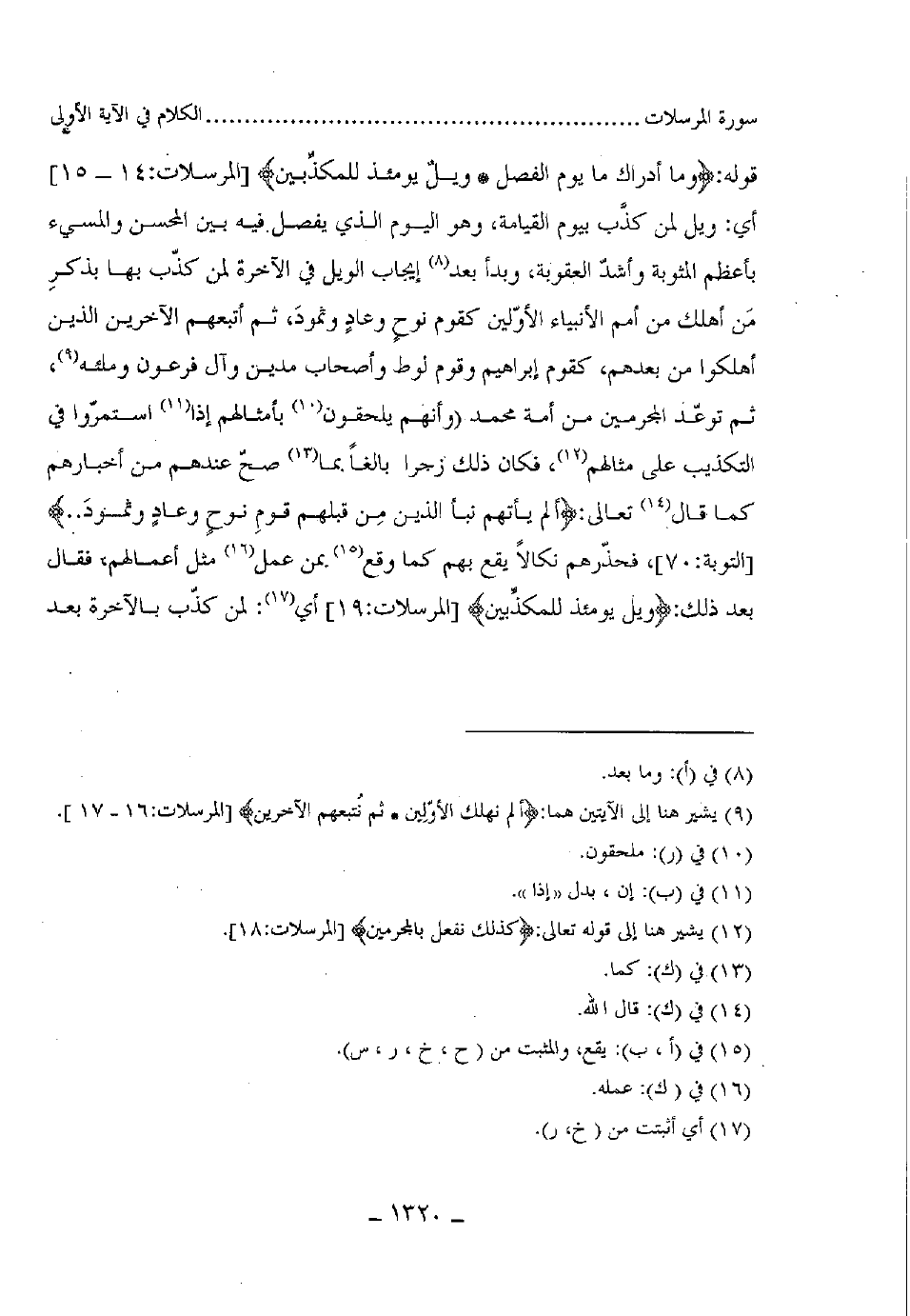 أي: ويل لمن كذب بيوم القيامة، وهو اليوم الذي يفصل. فيه بين المحسن والمسىء بأعظم المثوبة وأشدّ العقوبة، وبدأ بعد إيجاب الويل في الآخرة لمن كذب بها بذكرِ مَن أهلك من أمم الأنبياء الأوّلين كقوم نوح وعاد وثمودَ، ثم أتبعهم الآخرين الذين أهلكوا من بعدهم، قوم إبراهيم وقوم لوط وأصحاب مدين وال فرعون وملئه، ثم توعد المجرمين من أمة محمد - صلى الله عليه وسلم - (وأنهم يلحقون بأمثالهم إذا استمرّوا في التكذيب على مثالهم، فكان ذلكْ زجرا بالغا بما صحّ عندهم من أخبارهم كما قال تعالى: (أَلَمْ يَأْتِهِمْ نَبَأُ الَّذِينَ مِنْ قَبْلِهِمْ قَوْمِ نُوحٍ وَعَادٍ وَثَمُودَ)