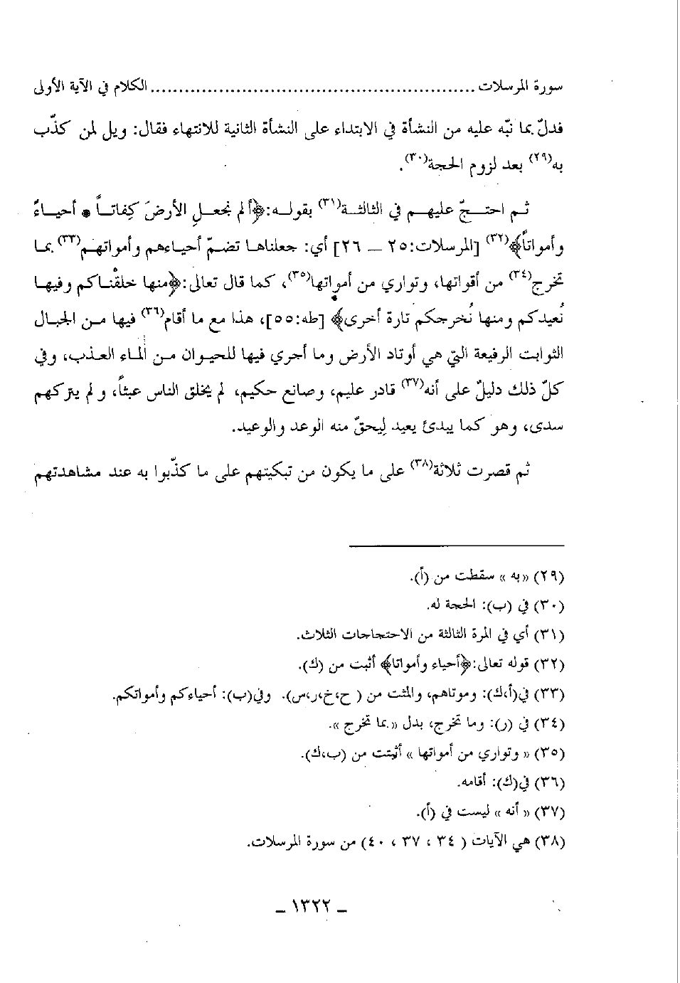ثم احتجّ عليهم في الثالثة بقوله: (ألم نجعلِ الأرضَ كِفاتاً أحياء وأمواتا) ، أي: جعلناها تضمّ أحياءهم وموتاهم، بما تخرج من أقواتها، وتواري من أمواتها، كما قال تعالى: (مِنْهَا خَلَقْنَاكُمْ وَفِيهَا نُعِيدُكُمْ وَمِنْهَا نُخْرِجُكُمْ تَارَةً أُخْرَى (55) ، هذا مع ما أقام فيها من الجبال الثوابت الرفيعة التي هي أوتاد الأرض وما أجري فيها للحيوان من الماء العذب، وفي كلّ ذلك دليل على أنه قادر عليم، وصانع حكيم لم يخلق الناس عبثا، ويتركهم سدى، وهو كما يبدي يعيد لِيحقّ منه الوعد والوعيد.