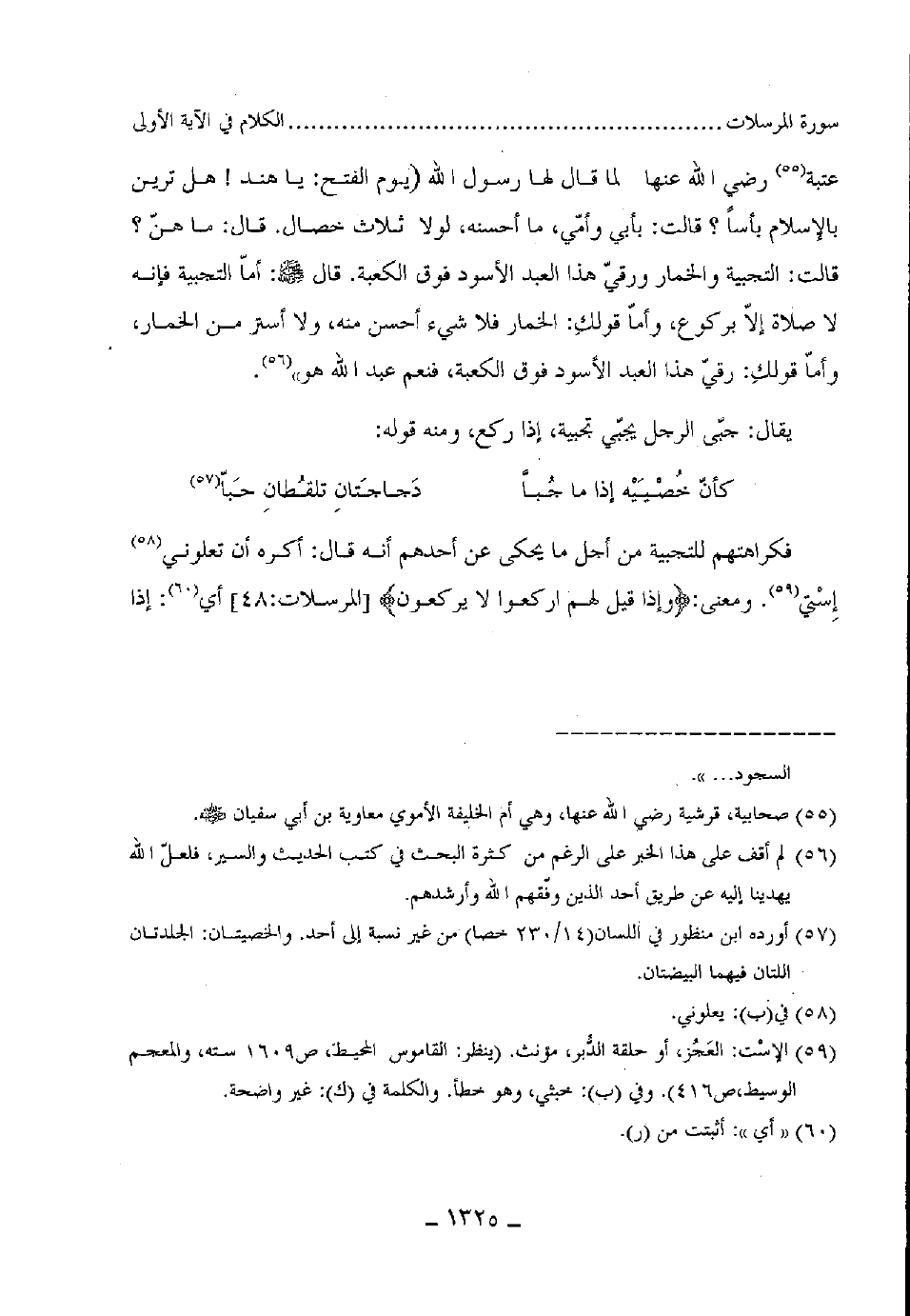 عتبة رضى الله عنها لما قال لها رسول الله - صلى الله عليه وسلم - (يوم الفتح: يا هند هل ترين بالاسلام بأسا؟ قالت: بأبي وأمّي، ما أحسنه، لولا ثلاث خصال. قال: ما هن؟ قالت: التجبية والخمار ورقيّ هذا العبد الأسود فوق الكعبة. قال - صلى الله عليه وسلم -: أماّ التجبية فإنه لا صلاة إلا بركوع، وأماّ قولكِ: الخمار فلا شيء أحسن منه، وأستر من الخمار، وأماّ قولكِ: ورقي هذا العبد الأسود فوق الكعبة، فنعم عبد الله هو) .